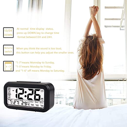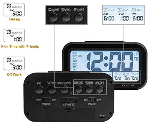 Bulfyss USB Rechargeable Digital Alarm Clock, Date, Temperature, Backlight LCD Display Smart Clock with 3 Alarms Bedroom Table Desk (Black)